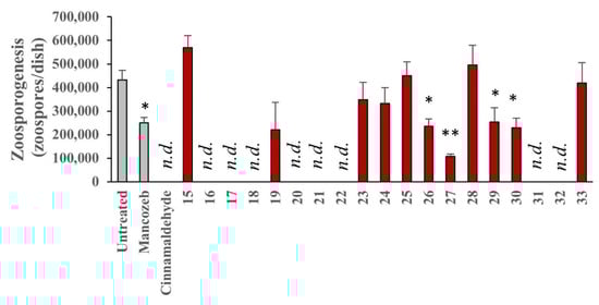 Effect of test compounds on P. infestans zoosporogenesis. P. infestans was cultured for 14 days on RyeB containing 25 μM of test compounds, 100 μM Mancozeb, 1 mM cinnamaldehyde, or vehicle (0.02% ethanol). Zoospores were then released from sporangia and counted using a haemocytometer. Data represent the absolute number of zoospores produced from each plate and are the mean of three independent experiments performed in duplicate. Error bars show the standard error in the mean values; n.d., no growth detected; and levels of statistical significance relative to V, determined using ANOVA are: * = p < 0.05; and ** = p < 0.01.