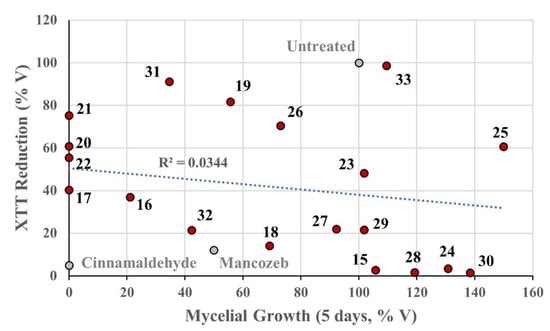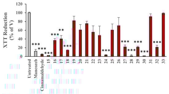 An XTT cytotoxicity assay was utilised to assess the toxicity of compounds against Human Embryonic Kidney 293T (HEK-293T) cells [41,42]. This is performed at a concentration of 25 μM to provide an indication as to which structures are the least toxic to humans. Cinnamaldehyde was used for comparison at a concentration of 1 mM; however, the active concentration of cinnamaldehyde was determined by Hu et al. to be 2 mM to completely inhibit mycelial growth [38]. Mancozeb 1, a commercial pesticide, was also tested at 100 μM as this was found to be the active anti-oomycete concentration by Shin et al. [40].