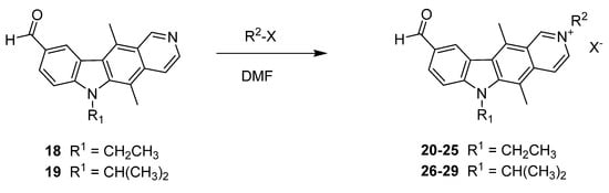 Alkylation at the 2-position is commonly used to increase the aqueous solubility of ellipticines and derive new bioactivity as it significantly affects the electronics of the system in forming a charged salt [33,34,35]. It was envisaged that this modification would affect the P. infestans inhibitory properties and the influence of alkyl chain length and terminal group was to be assessed. Compounds 18 and 19 were chosen as leads given their identified P. infestans growth inhibitory properties and the potential for generation of new chemical entities.