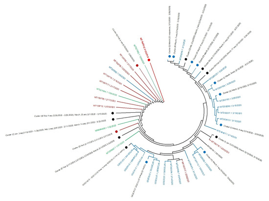 The phylogenetic tree of 196 complete SARS-CoV-2 genomic sequences of the USA and reference sequence (NC_045512) of Wuhan, China was constructed according to their collection date using MEGA-X software [27]. The evolutionary analysis was done using the maximum likelihood method and the Tamura–Nei model [28]. The tree reveals the history of the common ancestry of all 196 SARS-CoV-2 genome sequences from USA outbreak (Figure 1). The lines of a tree represent evolutionary lineages with the highest log likelihood (−2,497,132.35). Sequences were grouped by the taxon and shown as green, brown, and blue colors for January, February, and March, respectively. The tree shows the USA SARS-CoV-2 sequences differ from the reference sequence, NC_045512 of Wuhan, China. Also, the USA SARS-CoV-2 lineage is split into many sub-lineages, which are represented by different branches. Each branch of the tree ends with a cluster or a single sequence.