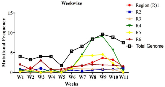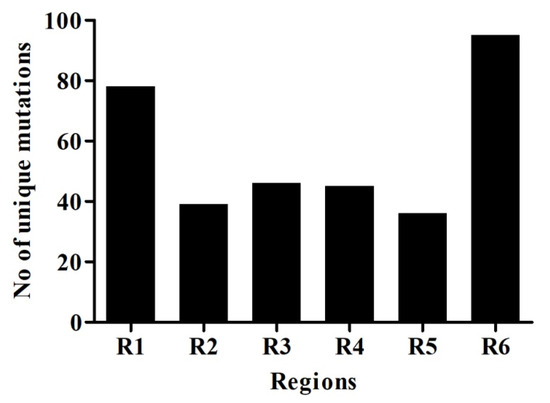 Mutations were grouped by the date and divided into seven days period, making a total of 11 weeks. Mutation frequency was calculated by taking the ratio of the number of total nucleotide mutations and the number of genome sequences in each week. Mutation frequency for whole genomes was observed to be low during the initial five weeks. However, after the first five weeks, the frequency seems to have increased sharply until week nine and remained similar or even slightly down in weeks 10 and 11 (Figure 2). To identify the regions with the most mutations over time, SARS-CoV-2 genome was divided into six regions of approximately 5 kb each and these were named as region 1 (1–5000 bp), region 2 (5001–10,000 bp), region 3 (10,001–15,000 bp), region 4 (15,001–20,000 bp), region 5 (20,001–25,000 bp), and region 6 (25,001–end) (Figure 3). This was done to facilitate the analysis of the large genome of the SARS-CoV-2 virus, which is 29,903 kb [10]. It appears that the mutational frequency of regions 1 (1–5000 bp), region 4 (15,001–20,000 bp), and region 5 (20,001–25,000 bp) increased over time with the higher frequency in weeks 7–10. Overall, the mutation frequency during entire period of analysis (11 weeks) was found to be highest in region 4, followed by regions 1, 5, and 6 (Figure 2). Regions 2 and 3 had the lowest mutation frequency and appeared to be more conserved. Unique mutations are also calculated by removing the redundant mutations identified in more than one week. Unique mutations per region per week are summarized in Supplementary Table S4. The total number of unique mutations accumulated during the entire 11 weeks were found to be highest in region 6 followed by region 1 as shown in Figure 4.