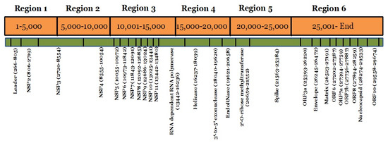 Mapping of SARS-CoV-2 genome regions and proteins. The SARS-CoV-2 genome was divided into six regions and the location of each protein in the different regions is schematically presented.