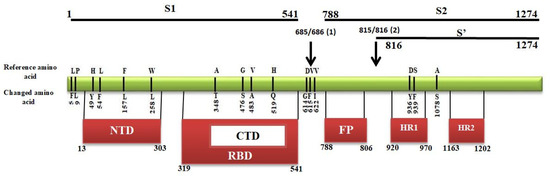 Transmembrane S glycoprotein assists the virus entry into the host cell. It is cleaved by the host proteases at two sites (685/686) and (815/816), producing S1, S2, and S’ subunits [34]. The two subunits, distal S1 and membrane-anchored S2, bind to the angiotensin converting enzyme 2 (ACE2) receptor and fuse with the cell membrane, respectively [35]. The S1 subunit contains the N-terminal domain (NTD), C-terminal domain (CTD), and receptor binding domain (RBD). S2 includes the fusion peptide (FP) and heptad repeats (HR1, HR2) regions, while S’ includes heptad repeats (HR1, HR2) regions (Figure 6). All domains are crucial for the virus interaction with the host cells as they function to bind to the receptor and mediate fusion with the host cell membrane [36,37]. Our analysis identified 16 mutation sites in the S protein, and all these mutations were nonsynonymous. Out of these 16 mutations, four were in NTD fragment, i.e., H > Y(49), L > F(54), F > L(157) and W > L(258) (Figure 6). Also, four mutations were found in the RBD region, A > T(348), G > S(476), V > A(483), and H > Q(519). The remaining eight sites were located in different regions within the protein, L > F(5), P > L(9), D > G(614), V > F(615), V > I(622), D > Y(936), S > F(939), and A > S(1078). The fusion peptide region was highly conserved as no mutation sites were found.
