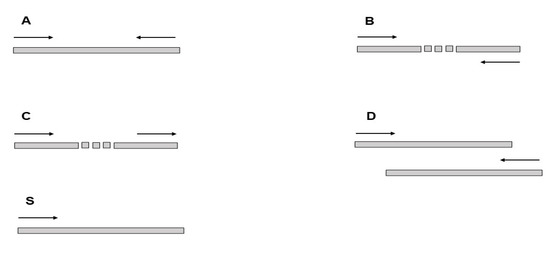 Schematic representation of A—(paired end reads), B—(putative intrachromosomal gene conversion events), C—(inversions), D—(putative interchromosomal gene conversion events), and S—(sole mapped) type reads.