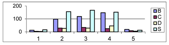 Polarity is one of the properties of gene conversion: in almost all cases the frequency of conversion exhibits a gradient “across” the gene [33,34,35]. Here, we studied a distribution of reads across protein-coding genes and 500 bases of flanking regions (Figure 2). The frequency of reads (B, C, D, and S) in the 3′ and 5′ UTRs was substantially lower, compared to the coding regions. We observed a polarity of B- and D-type reads with an increased number of reads toward 3′ end of the protein-coding sequences. C- and S-type reads are distributed more uniformly (Figure 2). We compared the distribution of reads in protein coding regions (bins 2, 3 and 4), and the difference between the distributions of B- and S-type reads is statistically significant (Pχ2 = 0.029, a modified χ2 test, see Materials and Methods). No other significant pairwise differences were detected. We also compared the distribution of reads in protein coding regions (bins 2, 3 and 4) to the uniform distribution using the Pearson’s χ2 test, the B-type read distribution was significantly different from the uniform distribution (Pχ2 = 0.006) whereas C-, D- and S-type read distributions were not significantly different from the uniform distribution.