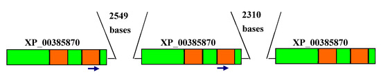 Schematic representation of regions of high and low similarity between XP_003858707.1, XP_003858708.1 and XP_003858709.1 sequences. Details are shown in the Supplementary Figure S3. Low similarity regions (less than 25% identity) are shown in green and high similarity regions (over 75% identity) are shown in red. Blue arrows represent two detected B-type reads.