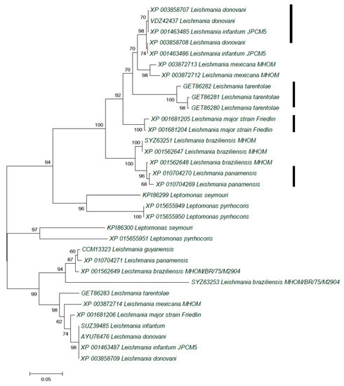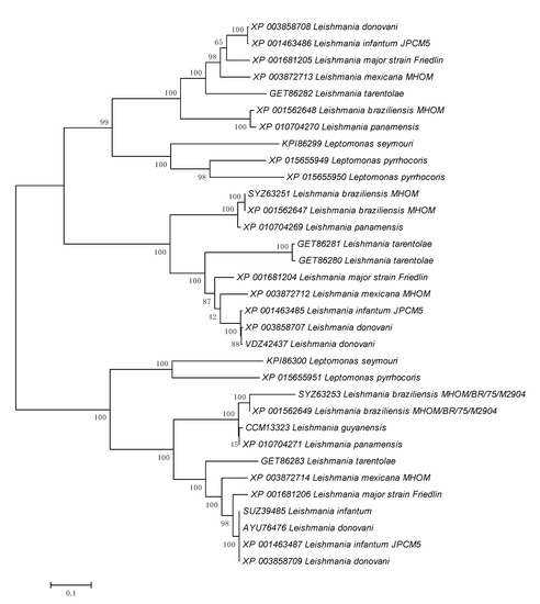 - Kostygov, A.Y.; Yurchenko, V. Revised classification of the subfamily Leishmaniinae (Trypanosomatidae). Folia Parasitol. 2017, 64, 20. [Google Scholar] [CrossRef] [PubMed]