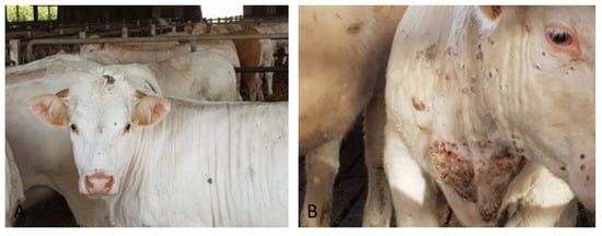 The first clinical case (#7) was identified on February 2018 at the slaughterhouse in a 20 months-old Charolaise cow in which cutaneous proliferative lesions were observed (Figure 1) and pathological skin samples were collected. Anamnesis reported a story of similar lesions in cattle from the same farm; the lesions appeared periodically but especially during the period December 2017–April 2018.