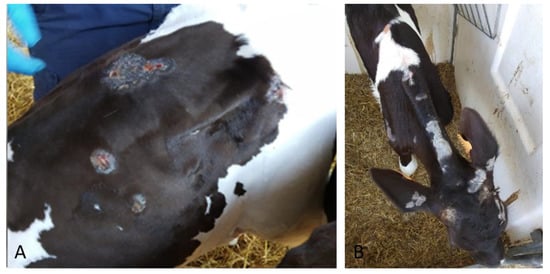 Skin lesion identified in a Fresian dairy farm sample (#1616). The animal presented lumps, (A) scattered circular areas of alopecia and surface crust formation on back, (B) neck, shoulders and head.