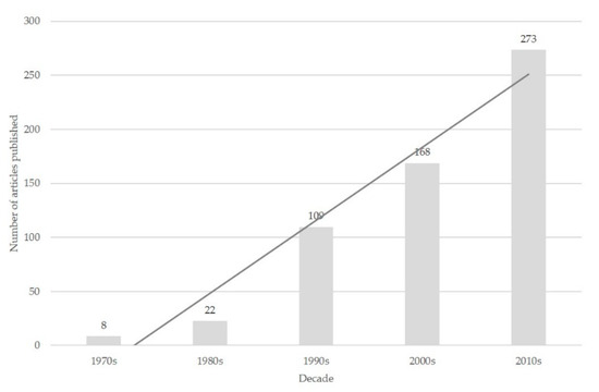 The number of papers published per decade in the topic increased progressively: 8 (1.4%) papers were published in the 1970s, 22 (3.8%) in the 1980s, 109 (18.8%) in the 1990s, 168 (28.9%) in the 2000s, and 273 (47.1%) in the 2010s (Figure 1).