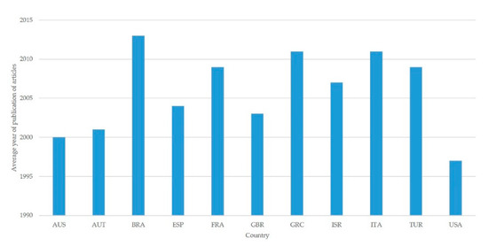 Differences in the year of publication are significant between the above 11 countries (p < 0.001). Papers from Brazil, Greece, and Italy are the most recent ones (average year of publication: 2013, 2011, and 2011, respectively), whilst papers from Australia and the United States of America are the oldest ones (average year of publication: 2000 and 1997, respectively) (Figure 2).