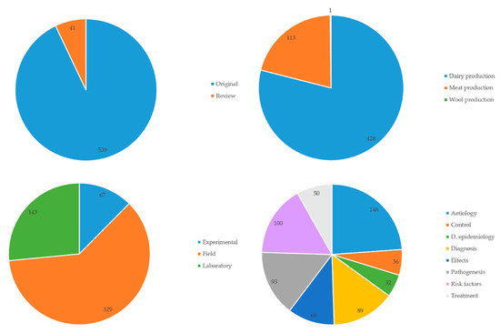 Most papers presented original studies (n = 539; 92.9%), and fewer ones presented reviews (n = 41; 6.1%). Most original papers referred to dairy production (n = 428; 79.4%), with fewer ones referring to meat (n = 113; 21.0%) or wool (n = 1) production. Most original papers presented field work (n = 329; 61.0%), and fewer ones presented laboratory (n = 143; 26.5%) or experimental (n = 67; 12.4%) work. Original studies reported mostly aetiology (n = 146; 27.1%), risk factors (n = 100; 18.6%), pathogenesis (n = 93; 17.3%), or diagnosis (n = 89; 16.8%) of the disease, whilst fewer papers existed on descriptive epidemiology (n = 32; 5.9%), control (n = 36; 6.7%), treatment (n = 50; 9.3%), or effects (n = 66; 12.2%) of the disease (Figure 3 and Figure 4, Table S4).