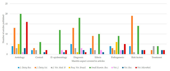 - Mastitis aspect described in the paper: (i) aetiology, (ii) control, (iii) descriptive epidemiology, (iv) diagnosis, (v) effects, (vi) pathogenesis, (vii) risk factors, or (viii) treatment; up to two of these were assigned per paper.