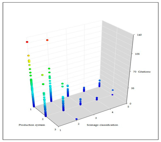 Association between production system referred to in papers, journal classification, and citations in papers on ovine mastitis published during the period 1970–2019 (Production system: 1 dairy, 2 meat, 3 wool; Scimago classification: 1 Q1, 2 Q2, 3 Q3, 4 Q4, 5 not included in the database).