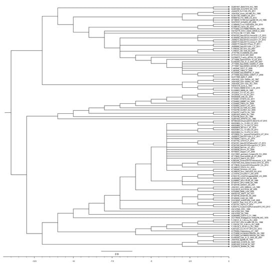 - Banet-Noach, C.; Malkinson, M.; Brill, A.; Samina, I.; Yadin, H.; Weisman, Y.; Pokamunski, S.; King, R.; Deubel, V.; Stram, Y. Phylogenetic Relationships of West Nile Viruses Isolated from Birds and Horses in Israel from 1997 to 2001. Virus Genes 2003, 26, 135–141. [Google Scholar] [CrossRef]