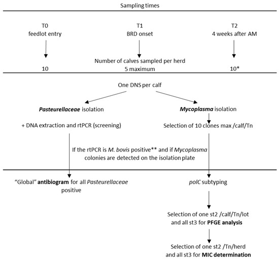 Becker, C.A.M.; Ambroset, C.; Huleux, A.; Vialatte, A.; Colin, A.; Tricot, A.; Arcangioli, M.-A.; Tardy, F. Monitoring Mycoplasma bovis Diversity and Antimicrobial Susceptibility in Calf Feedlots Undergoing a Respiratory Disease Outbreak. Pathogens 2020, 9, 593. https://doi.org/10.3390/pathogens9070593