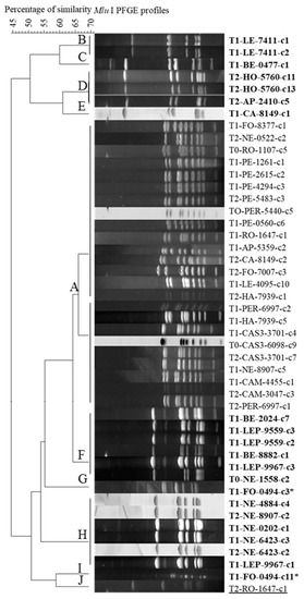 2.2. The Diversity of Clones Does Not Differ at Different Sampling Times and Is Similar to the Reference Population of Vigimyc Isolates