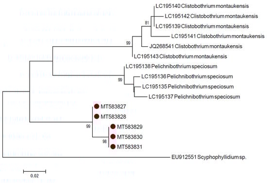 - Kumar, S.; Stecher, G.; Li, M.; Knyaz, C.; Tamura, K. MEGA X: Molecular Evolutionary Genetics Analysis across computing platforms. Mol. Biol. Evol. 2018, 35, 1547–1549. [Google Scholar] [CrossRef] [PubMed]