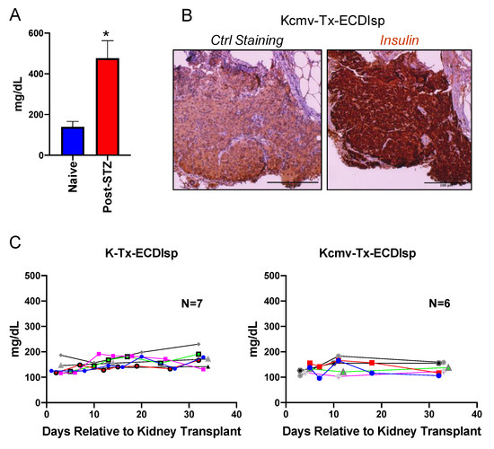 ECDIsp treatment validates continued tolerance of initial islet grafts even after implantation of second latently-infected donor solid organ. (A) Blood glucose measurements in naïve mice and mice 3 days post-STZ treatment. (B) Representative Insulin staining of transplanted islet grafts 30–35 days post kidney transplantation. Ctrl = Control. Original magnification: 200×. (C) Blood glucose measurements demonstrating normoglycemia and islet graft tolerance of mice following kidney transplantation for recipients in ECDIsp+(I)(K-) and ECDIsp+(I)(K+) groups. For (A), n = 3 mice per group. For (B), Scale Bar is 100 micrometers. * p < 0.05.