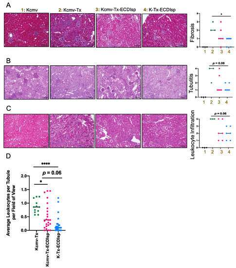 We next directly evaluated the secondary kidney allografts after implanting in MCMV seronegative pre-tolerized recipients. We had chosen to examine the allografts at 30 days post renal transplant as a sufficient time frame to monitor viral replication, islet graft prolonged tolerance, and kidney graft survival. Because the primary islet grafts were initially implanted into a recipient kidney capsule (of the contralateral kidney to the subsequent kidney transplant), it was not possible to track functional parameters of renal function (such as blood urea nitrogen or creatinine) [17]. Instead, we focused our evaluation of kidneys by histology and flow cytometric analysis at the 30-day window post-kidney transplant. Compared to recipients that were not administered ECDIsp, ECDIsp-treated transplant recipients displayed significantly controlled graft weights (Supplementary Figure S2). At the level of graft histology, interstitial fibrosis (as a marker of graft rejection) was decreased in the ECDIsp-treated groups compared to the non-ECDIsp-treated group (Figure 3A). A significant reduction in fibrotic mean score was measured between ECDIsp-treated non-latently infected (K-Tx-ECDIsp) and the kidney graft rejecting control (Kcmv-Tx). Compared to our positive control for graft rejection, Periodic acid-Schiff (PAS) and hematoxylin and eosin (H&E) staining consistently exhibited reductions in both tubulitis and mononuclear cellular infiltration in the ECDIsp-treated groups (Figure 3B,C). There were no significant differences in graft myeloid infiltrate between the ECDIsp-treated groups, but histological mean values were consistently lower for non-latently infected (K-Tx-ECDIsp) grafts. Closer examination of average numbers of mononuclear cell infiltration per renal tubule demonstrates a significant reduction of infiltrating cells in ECDIsp-treated groups compared to the rejecting control (Kcmv-Tx). Collectively, these data suggest that ECDIsp-treated islet recipients were also hypo-responsive to secondary challenge with donor alloantigen, and that latently infected allografts trended with a higher inflammatory signature.