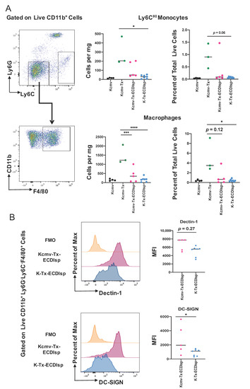 By flow cytometry-assisted quantification of cells per milligram of kidney graft and percentage of total live cells, Ly6CHI monocytes were found to be lower in the ECDIsp-treated non-latently infected recipients (K-Tx-ECDIsp) when compared to the non-ECDIsp-treated rejecting control (Kcmv-Tx) (Figure 4A). Graft F4/80-high macrophages were decreased in both ECDIsp-treated groups compared to the non-ECDIsp-treated rejecting control (Figure 4B). Once again, the CMV group trended with higher levels of monocytes and macrophages. In addition, we examined a mark of innate trained immunity, DECTIN-1, which has been linked to transplant rejection and inflammation [28]. Comparing ECDIsp-treated groups, latently infected grafts (Kcmv-Tx-ECDIsp) displayed an increased trend in DECTIN-1 expression on F4/80+ innate Mɸs (Figure 4B). Furthermore, DC-SIGN, which has been linked to viral infection, was significantly increased in latently infected (Kcmv-Tx-ECDIsp) graft Mɸs (Figure 4B) [29]. Collectively, the overall profile of innate immune cells and Mɸs in latently infected Kcmv-Tx-ECDIsp kidney allografts, relative to non-latently infected (K-Tx-ECDIsp) kidney allografts, was consistent with an elevated innate immune response.