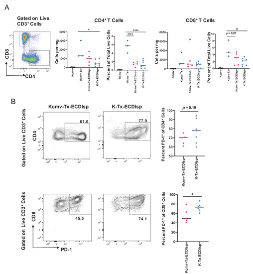 There were no significant differences in lymphocyte infiltrate between the ECDIsp-treated groups, but mean values were consistently lower for non-latently infected (K-Tx-ECDIsp) grafts (Figure 5A). ECDIsp treatment led to a significant decrease of CD4+ T cell frequency per mg of tissue and percent of total live cells relative to non-ECDIsp-treated recipient rejecting controls (Kcmv-Tx) (Figure 5A). Similarly, graft infiltrating CD8+ cell frequency of total live cells was significantly lower in the tolerance-induced group. We also examined the profile of specific T cell activation markers within the ECDIsp-treated groups. For example, higher frequencies of PD-1-expressing T cells have been shown to be critical for tolerance prolongation as a marker of T cell exhaustion [30]. In this context, latently infected (Kcmv-Tx-ECDIsp) grafts exhibited a decreased frequency of PD-1 expressing CD8+ cells (Figure 5B), consistent with a heightened T cell response. PD-1 expressing CD4+ cells in latently infected (Kcmv-Tx-ECDIsp) grafts also trended lower.