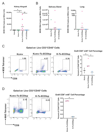 Elevation of viral activation and dissemination markers in pre-tolerized recipients transplanted with latently-infected kidney allografts. (A) Quantitative PCR to determine Viral DNA (IE1) copy numbers in the grafts of donor contralateral control, Kcmv-Tx-ECDIsp recipients, and K-Tx-ECDIsp recipients. (B) Viral DNA (IE1) copy numbers in the salivary glands and lungs of Kcmv-Tx-ECDIsp recipients and K-Tx-ECDIsp recipients. (C) Representative dot-plot showing percentage of m38 specific CD8+ T Cells at ~30 days post kidney transplant. Bar graph denotes the frequency of m38 specific CD8+ T Cells in Kcmv-Tx-ECDIsp and K-Tx-ECDIsp grafts. (D) Representative dot-plot showing percentage of m45 specific CD8+ T Cells. Bar graph denotes the frequency of m45 specific CD8+ T Cells in Kcmv-Tx-ECDIsp and K-Tx-ECDIsp grafts. Statistical significance was determined by a Kruskal–Wallis one-way ANOVA, one-way ANOVA or student’s t-test. * p < 0.05, ** p < 0.01. For (A,B), n = 6–7 mice per group. For (C,D), n = 2–4 mice per group.