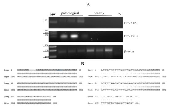 RT-PCR and amplicon sequences for BPV-2 and BPV-13 E5. (A) Electrophoresis of RT-PCR products for the analysis of BPV-2 and BPV-13 E5 mRNA expression in healthy and pathological bovine bladders. Lane MW: DNA molecular weight marker (100-base pair ladder); lanes 2–4: three representative papillary urothelial cancer samples; lanes 5–7: healthy bladder samples; lane C-: no template control (no cDNA added). (B) Amplicon sequences showing 100% identity with BPV-2 and BPV-13 E5 sequences deposited in GenBank (accession number: M20219.1 and JQ798171.1, respectively).