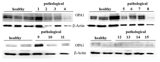 OPA1 and the PHB complex play a crucial role in mitochondrial integrity. OPA1 mediates IMM fusion and preserves cristae morphogenesis [26]. Therefore, we investigated its expression. Western blot analysis performed on total extracts revealed an evident OPA1 expression both in healthy and diseased samples (Figure 3).