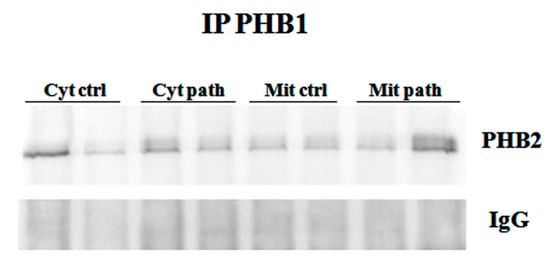 IP PHB1. Mitochondrial and cytosolic immunoprecipitation using an anti-PHB1 antibody in non-neoplastic and neoplastic bladder samples. Western blot analysis detected PHB2, which suggested that PHB1 and PHB2 formed a functional complex. IgG: control isotype. Cyt crtl and Cyt path = cytosolic fraction, control and pathological; Mit crtl and Mit path = mitocondrial fraction, control and pathological).