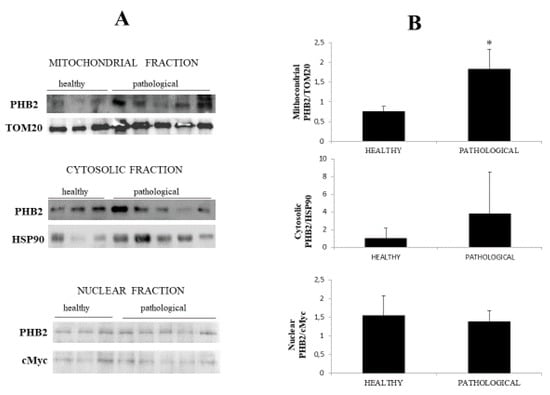 Western blot analysis of PHB2. (A) Western blot analysis of PHB2 in normal and neoplastic bovine bladder samples in the subcellular fractions. (B) Densitometric analysis of mitochondrial PHB2 level was performed relative to Tom 20 protein level. HSP90 and c-Myc were used as cytosolic and nuclear markers, respectively. PHB2 was found to be significantly overexpressed at the mitochondrial level in samples from neoplastic bladder mucosa. The calculations were based on three independent determinations. The values for the latter are expressed as a percentage of the average values for the healthy samples (* p ≤ 0.05).