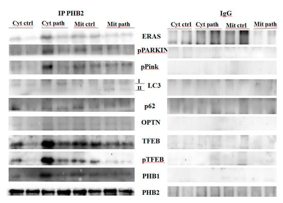 IP PHB2. Mitochondrial and cytosolic immunoprecipitation using an anti-PHB2 antibody in non-neoplastic and neoplastic bladder samples. Western blot analysis showing that PHB2 interacts with ERAS, pParkin, pPINK1, LC3, p62, OPTN, TFEB, pTFEB and PHB1. IgG: control isotype. Cyt crtl and Cyt path = Cytosolic fraction, control and pathological; Mit crtl and Mit path = mitochondrial fraction, control and pathological).