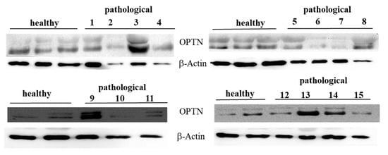 OPTN, a novel autophagy receptor, is recruited, independently on p62, to damaged mitochondria for regulating their autophagic turnover during parkin-mediated mitophagy [36]. OPTN interacts with LC3 through its LIR; its potential interplay, synergism, and functional redundancy with other autophagy receptors have been suggested [37]. Therefore, we investigated the expression profile of this autophagy receptor. Western blot analysis detected an OPTN expression both in healthy and neoplastic samples (Figure 9).