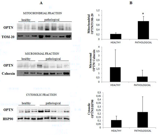 Immunoblotting performed on subcellular fractions revealed a significant (p ≤ 0.05) overexpression of mitochondrial OPTN only in urothelial cells infected by BPVs in comparison with non-infected urothelial cells. Unchanged OPTN expression levels were seen at the cytosolic and microsomal levels of both healthy and pathological urothelial cells (Figure 10A,B).