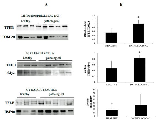 Western blot analysis of TFEB. (A) Western blot analysis of total TFEB in the subcellular fractions of healthy and neoplastic samples. (B) Densitometric analysis for TFEB proteins was performed comparing the expression levels of total TFEB with Tom 20 as mitochondrial, c-Myc as nuclear and HSP90 as cytosolic markers, respectively, and showed that mitochondrial and nuclear total TFEB was significantly overexpressed in the neoplastic bladder mucosa samples (* p ≤ 0.05).