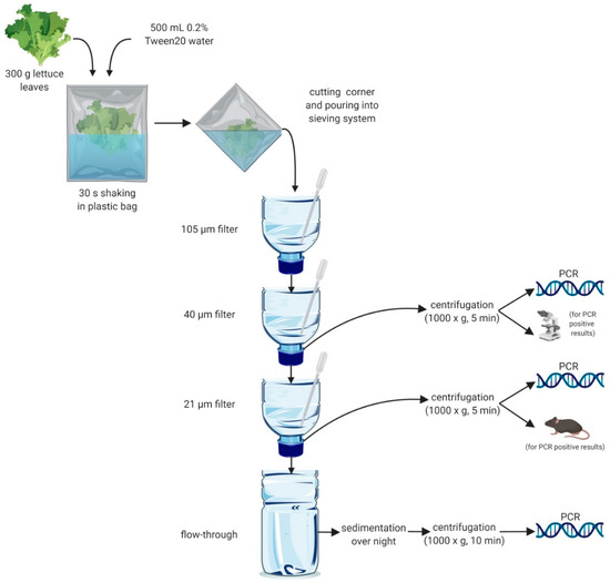 The aim of this study was to develop and validate a practical and straightforward method for the isolation of environmentally resistant parasite stages from fresh produce (lettuce) and minimizing laboratory DNA contamination by a one-way system. Furthermore, the practicability and sensitivity of the assay were validated by using parasite stages of three sentinel zoonotic agents with different sizes: large embryonated eggs of Toxocara spp. (70–90 µm), medium-sized viable eggs of E. multilocularis (30 to 40 μm) and small sporulated oocysts of T. gondii (11 × 13 μm).