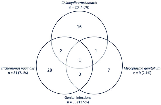 Venn diagram with absolute numbers and prevalence (%) of infections in tested vaginal samples from 439 pregnant women.