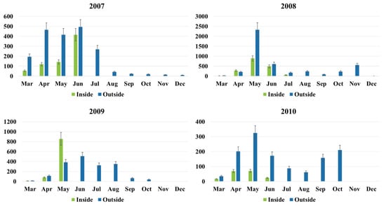 Average thrips populations determined from counts made on yellow sticky cards placed inside and outside of monitored tomato transplant greenhouses in the Central Valley of California from 2007 to 2010. Numbers indicate average thrips counts per card per month.