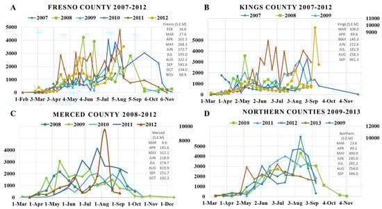 In these counties, thrips populations usually started to build up in late March/early April (100–300 thrips per card), similar to Merced County. Populations rapidly reached high levels (>1000 thrips per card) by May/June and even higher levels between July–September (2000–4000 thrips per card; Figure 3D). In 2009 and 2013, the build-up of thrips populations started earlier, and overall populations were higher than those detected in other years (Figure 3D). In 2011, thrips populations were not detected until late May, which was three weeks later than in other years (Figure 3D); this can be attributed to the cool spring temperatures that year. Interestingly, in all years, average thrips populations in northern county fields were usually ~two-fold higher than those in monitored fields in other counties (Figure S1A,B,D). Populations declined between October–November (50–150 thrips per card), and remained at very low levels during the winter (10–30 thrips per card; Figure 3D).