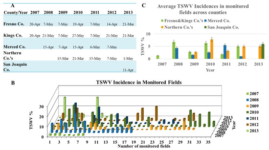 Survey of Tomato spotted wilt virus (TSWV) in monitored processing tomato fields in the Central Valley of California: date of first detection (A), incidence of TSWV in monitored fields from 2007 to 2013 (B), and average incidences of TSWV in monitored fields by county (C).