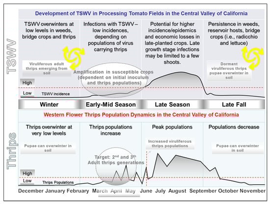 Following the results of research on thrips population densities, TSWV development and other aspects of TSWV epidemiology, a model was developed for how thrips and TSWV build up in the Central Valley of California (Figure 8). In this model, low thrips populations and low incidences of TSWV overwinter in weeds and bridge crops during winter months. In the spring, as temperatures increase, thrips populations (and activities) slowly increase and some thrips reproduce on TSWV-infected plants, resulting in a generation of a population of viruliferous adult thrips that transmit the virus to susceptible crops. Both thrips and TSWV are then amplified in these crops (e.g., tomato and pepper). Rate and intensity of amplification is temperature dependent and, thus, varies from year-to-year. Later in the season, viruliferous thrips populations developing from infected plants spread the virus between and within the fields. Thus, the highest TSWV incidences generally occur in late-planted fields, especially fields planted next to early-planted fields with TSWV-infected plants. Following the tomato harvest, viruliferous thrips disperse and transmit TSWV to bridge crops (Supplementary Figure S3) and weeds, where overwintering occurs. Additionally, some thrips can overwinter as pupae in the soil [31]. In the spring, as soil temperatures increase, adult thrips emerge from soil and some of these may be viruliferous (discussed later). Thus, viruliferous adult thrips from pupae that are coming from TSWV-infected bridge crop and/or weeds also can possibly transmit the virus to susceptible crops (Supplementary Figure S3).