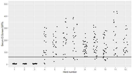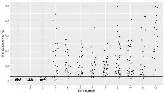 The serum and milk ID screen sample-to-positive percentage (S/P%) was plotted with jittered dots for each of the 12 herds (Figure 1 and Figure 2). All cows had a S/P% below the recommended cutoff in both serum and milk in three herds (herds 1–3). In all other herds, all or nearly all cows had a S/P% above the recommended cutoff.