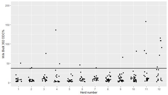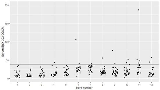 The serum and milk BioX 302 sample-coefficient (ODC%) was plotted with jittered dots for each of the 12 herds (Figure 3 and Figure 4). All, but 16 cows from seven different herds had serum ODC% values below the recommended cutoff in serum, while all, but 17 cows from nine different herds had milk ODC% values below the recommended cutoff.