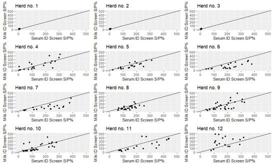 The concordance correlation coefficient between serum and milk S/P% was 0.66 (95% CI: 0.59–0.72). In general, the serum values were higher than the milk values, except in herd 12 (Figure 5). This could be explained by different clinical manifestations, e.g., clinical or subclinical mastitis cases could induce mostly high milk S/P% and systemic disease could induce mostly high serum S/P%, as previously shown when using the BioX 302 test [8]. This may also be the case for the ID screen, but to a lesser degree since the cows still test positive in both serum and milk.