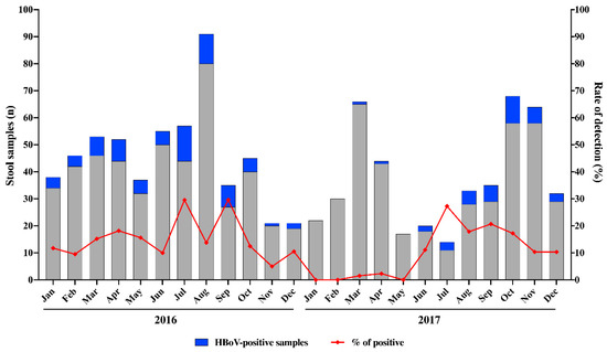 During the two-year period of this study (2016–2017), we analysed a total of 886 stool samples from symptomatic children aged ≤2 years. Overall, HBoV was detected in 110 samples (12.4%) by qPCR. Of these, HBoV was detected in 15.3% (73/478) and in 9.1% (37/408) of samples collected in 2016 and 2017, respectively. We detected HBoV year-round without a marked seasonality. However, higher HBoV circulation was observed between July and September (Figure 1). Except for three months that HBoV was not detected, monthly detection rates varied from 5% to 29.6% in 2016, and from 1.5% to 27.3% in 2017 (Figure 1).