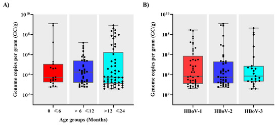 Regarding DNA quantification, qPCR results demonstrated that HBoV viral load varied broadly among patients, ranging from 3.9 × 102 to 1.2 × 109 GC/g of stool samples, with a median of 6.7 × 103 GC/g. No significant differences were observed between HBoV viral load and age groups (Figure 2A) or among HBoV-1, 2 or 3 genotypes (p > 0.05) (Figure 2B).