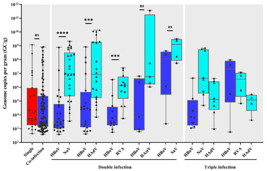 Human bocavirus (HBoV) viral load among single and co-infections, and analysis of enteric viruses’ viral load among HBoV-positive co-infected samples. Box-and-whisker plots show the first and third quartiles (equivalent to the 5th and 95th percentiles), the median (the horizontal line in the box), and range of HBoV viral load concentrations, expressed as genome copies per gram of stool (GC/g). ns, not significant; *** p ≤ 0.001; **** p ≤ 0.0001.