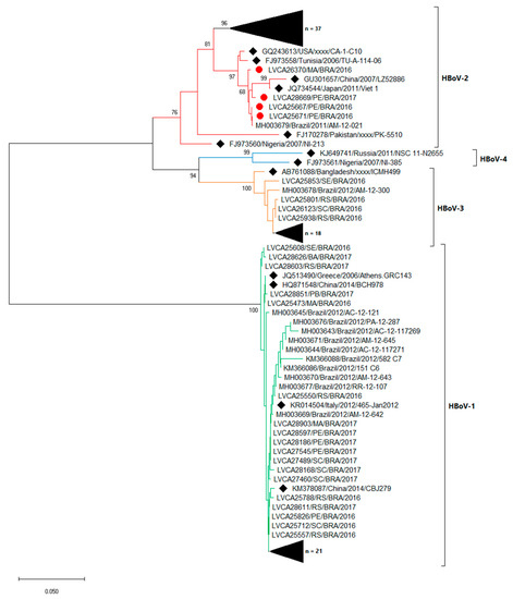 Phylogenetic analyses based on VP1 nucleotide (nt) sequences of circulating Brazilian human bocavirus (HBoV) strains. Reference strains, marked with a black filled diamond, were downloaded from GenBank and labelled with their accession number followed by country, year and register number. Strains obtained are shown as per LVCA followed by the internal register number, state, country and year of collection (i.e., LVCA28597/PE/BRA/2017), and the red filled circle represents sequences with a three-nt insertion. Neighbour-joining phylogenetic tree was constructed with MEGA X software and bootstrap tests (2000 replicates), based on the Kimura two-parameter model. Bootstrap values above 70% are given at branch nodes.