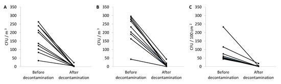 After autopsies, the mean bacterial burden in the air was 171 (range 35–263) colony forming units (CFU)/m3, and it decreased to 3 (0–23) CFU/m3 after decontamination (Figure 1). The mean fungal burden in the air was 221 (43–290) CFU/m3, and it decreased to 9 (0–43) CFU/m3 after decontamination (Figure 1).