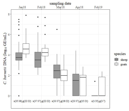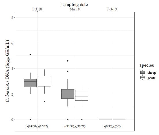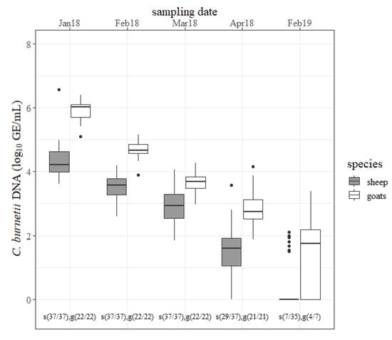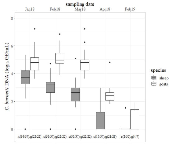 Quantity of Coxiella burnetii DNA (log10 GE/mL) determined on vaginal swabs from sheep (gray) and goats (white) for each sampling date (month/year). s = sheep, g = goats, and the number in brackets = the number of positive tested vaginal swabs/number of examined vaginal swabs.